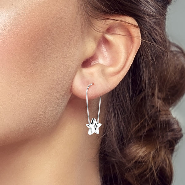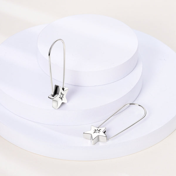 Com um charmoso pingente em formato de estrela, esses brincos transmitem leveza e brilho sutil. A pequena zircônia central adiciona um ponto de luz delicado, criando um efeito elegante e discreto.