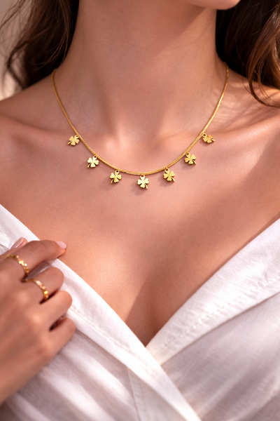 O Colar com Pingentes de Trevo da Sorte em Aço Inoxidável Romanely é o acessório ideal para quem procura um toque delicado e simbólico no seu estilo. Com um design composto por múltiplos pingentes em formato de trevo, destaca-se pela combinação entre elegância e o significado associado à sorte e prosperidade.