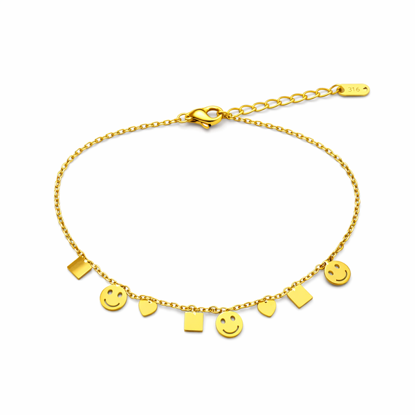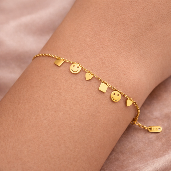 A Pulseira Dourada Coração e Smile Fina em Aço Inoxidável Romanely é uma peça encantadora que funde o romantismo clássico com a descontração da estética moderna. Este design novo apresenta uma corrente de malha delicada onde se intercalam o símbolo universal do amor e o ícone "smile", transmitindo uma mensagem de positividade e alegria. É o acessório perfeito para quem procura uma joia que equilibre sofisticação com um toque de personalidade vibrante e jovial.