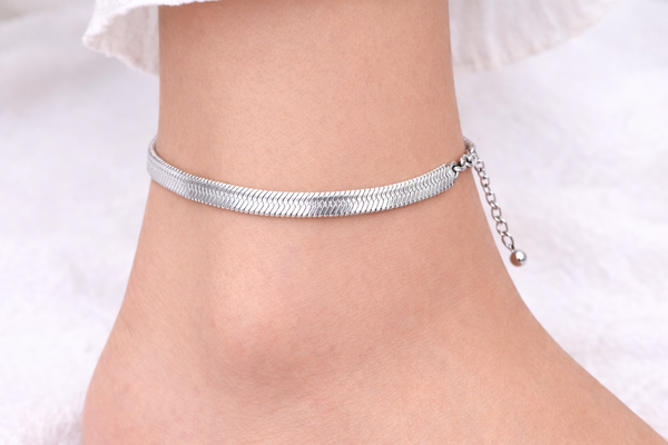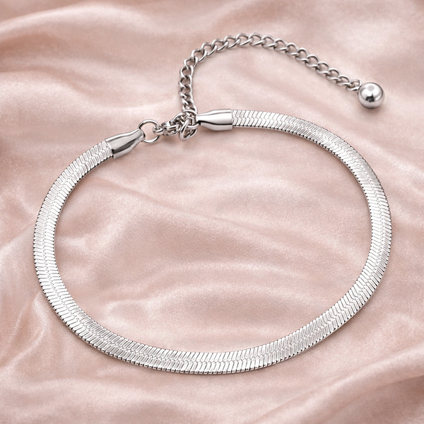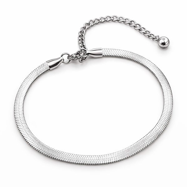 A Tornozeleira Flat Snake Prateada em Aço Inoxidável Romanely é uma peça de estética minimalista e moderna que se destaca pela sua malha densa e plana, inspirada na fluidez do movimento de uma serpente. Este design inovador permite que a luz deslize de forma contínua sobre a superfície metálica, criando um reflexo prateado espelhado que confere um ar de sofisticação e elegância industrial à joalharia contemporânea.