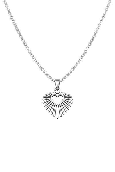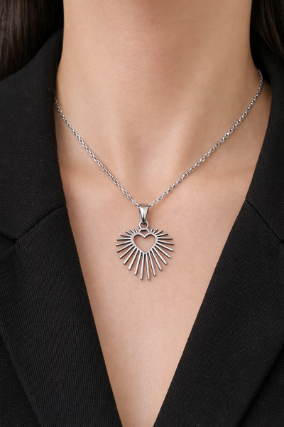 O Colar Prateado com Pingente Coração Radiante em Aço Inoxidável Romanely é o acessório ideal para quem procura um toque elegante e simbólico no seu estilo. Com um design em formato de coração envolvido por linhas radiantes, esta peça destaca-se pela sua estética moderna e delicada, representando amor, luz e conexão.