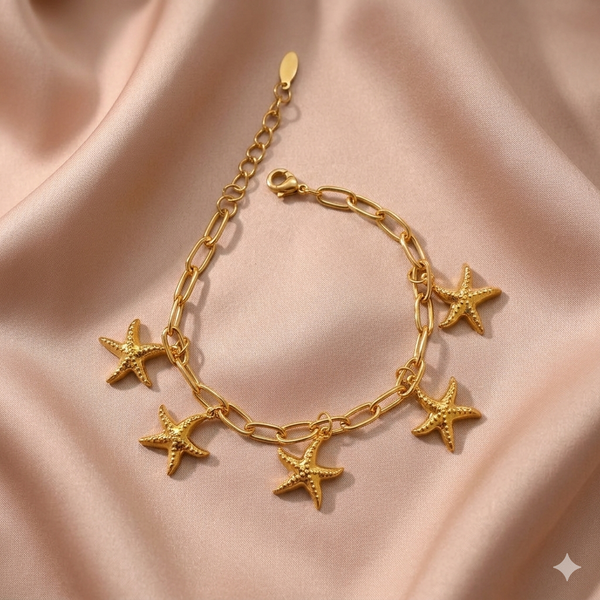 Fabricada em Aço Inoxidável 316L com banho dourado de alta qualidade, esta joia é hipoalergénica e resistente à oxidação, garantindo que o brilho e os detalhes das estrelas do mar permaneçam intactos mesmo com o uso frequente.